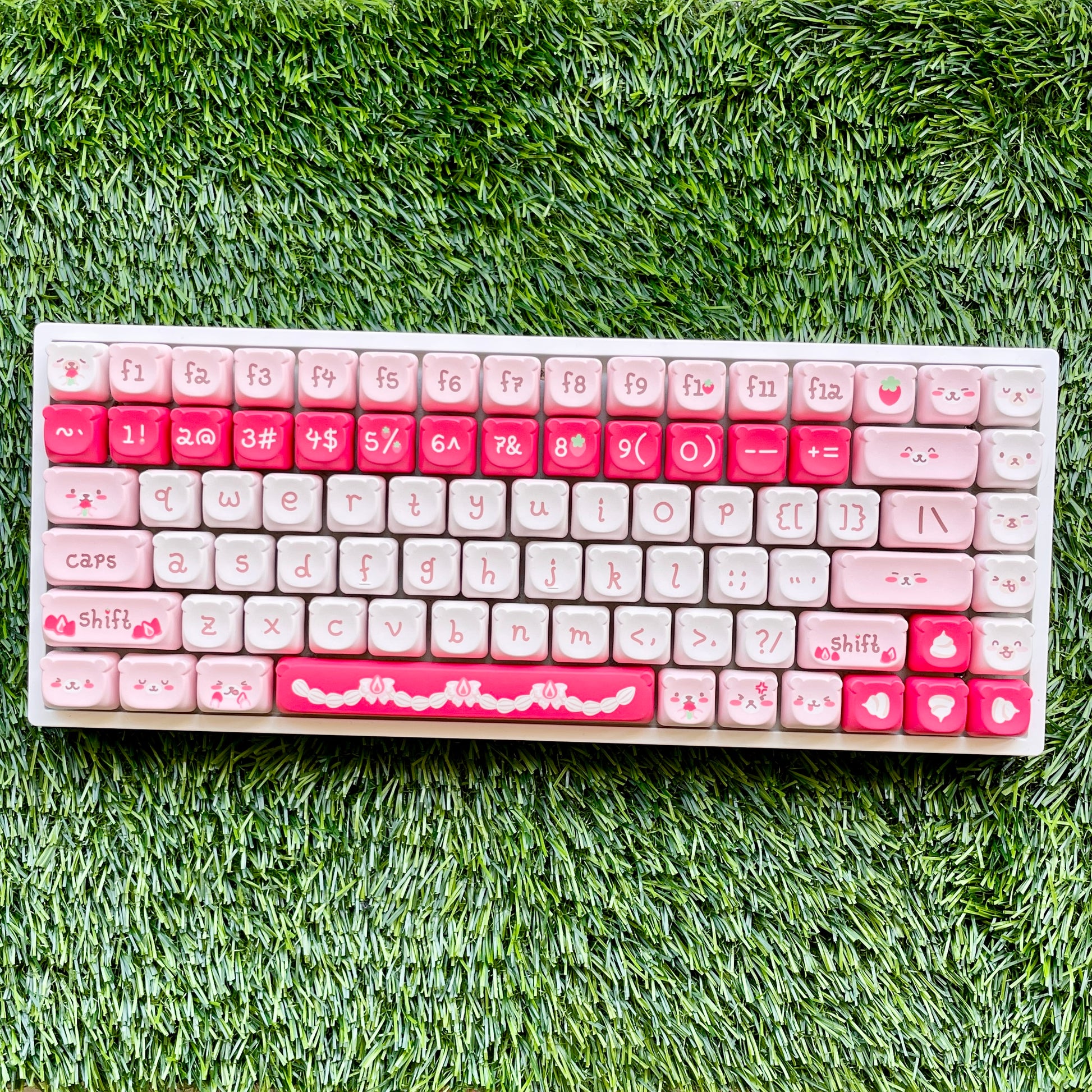 Set of 138 bear shaped keycaps with a cute strawberries and cream theme in light pink, red, and cream